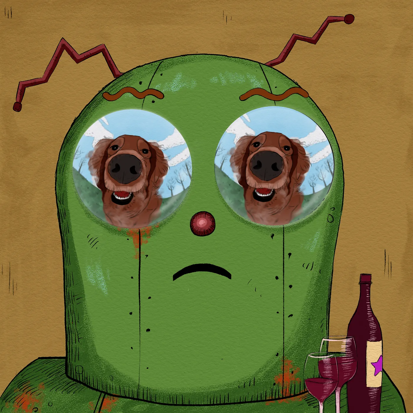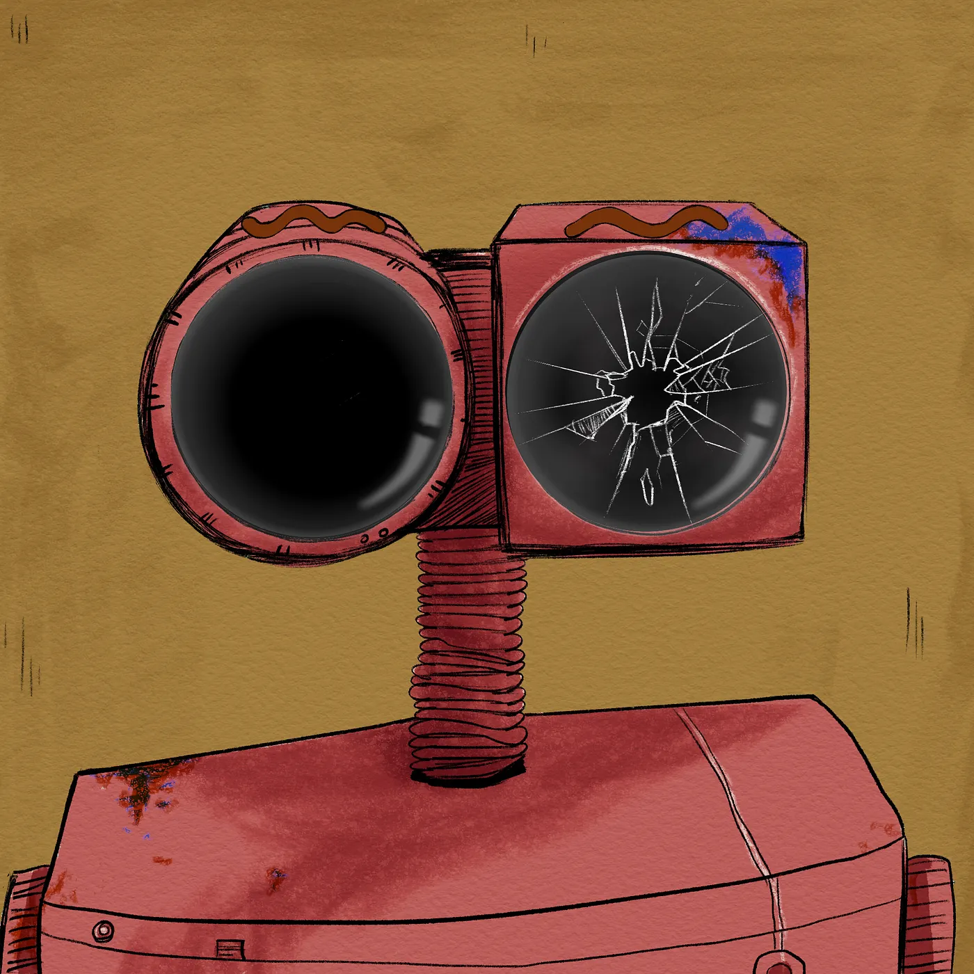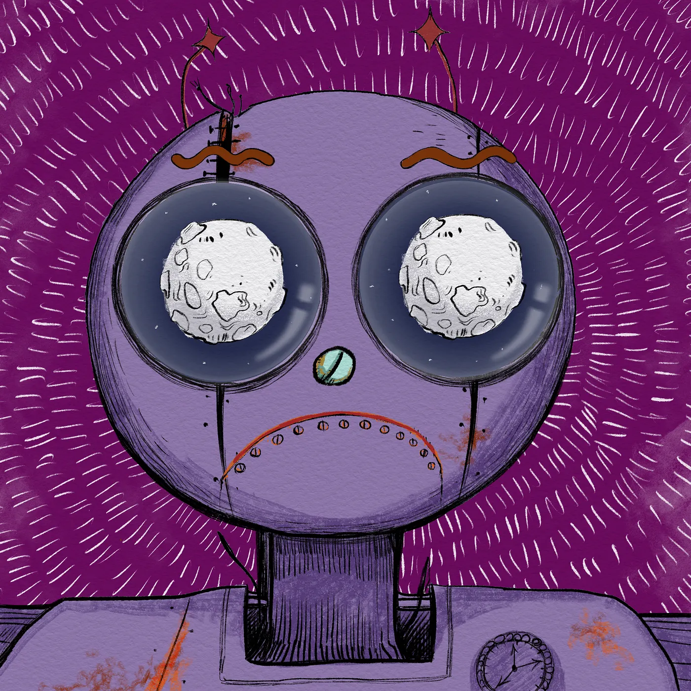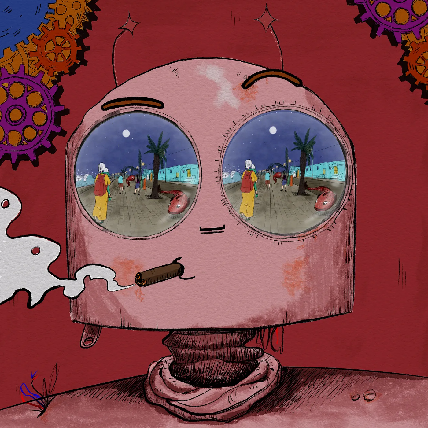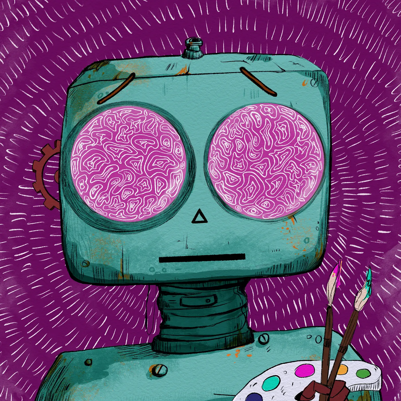Each robot possesses a unique pair of eyes. Within them, a complete painting is reflected — symbols of dreams, ambition